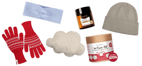 Unbeschwert geniessen – mit warm-würzigen Duftkerzen, leckeren Zimt-Snackdatteln, heissem Tee und kuscheligen Wärmekissen für eine gemütliche, bewusste Weihnachtszeit.